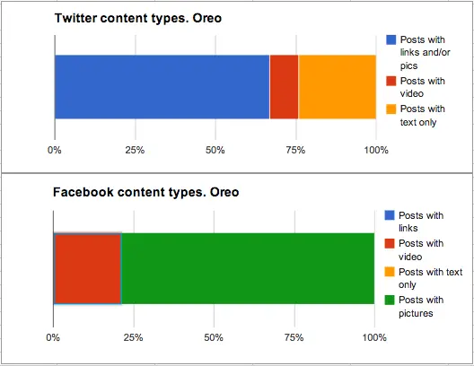 Bien sûr, différents types de contenu fonctionnent mieux sur différents réseaux sociaux. Alors, pour satisfaire notre curiosité, comparons la structure de contenu d'Oreo pour Twitter et Facebook.