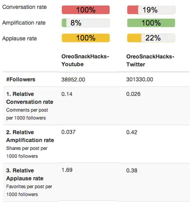 Même en termes relatifs pour 1000 abonnés, Twitter gagne pour la viralité (taux d'amplification relative), mais YouTube bat Twitter pour le taux de conversation relatif et le taux d'applaudissements relatifs. Cela démontre clairement que différents réseaux sociaux créent des réponses différentes - Twitter est conçu pour le partage, tandis que YouTube est conçu pour les conversations.